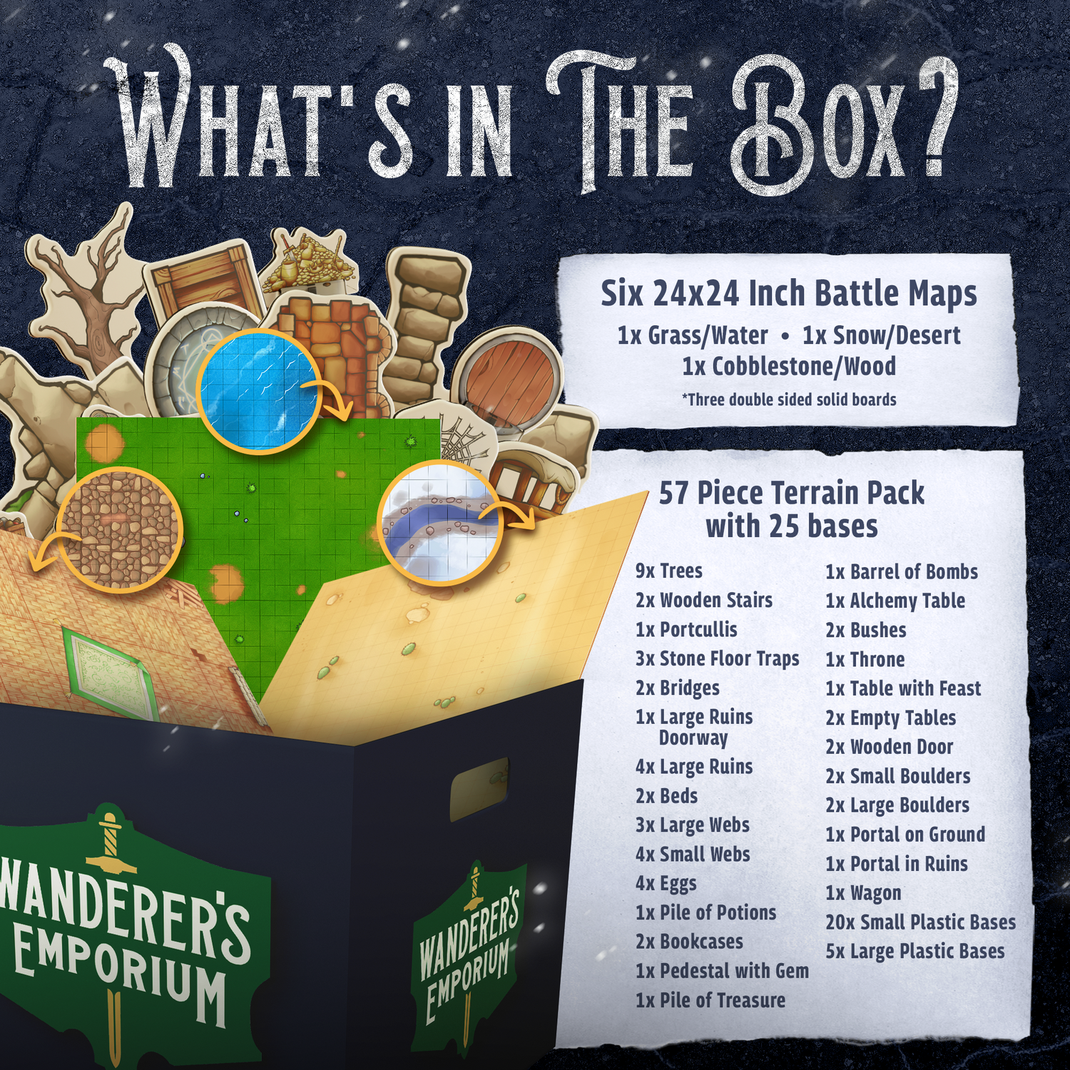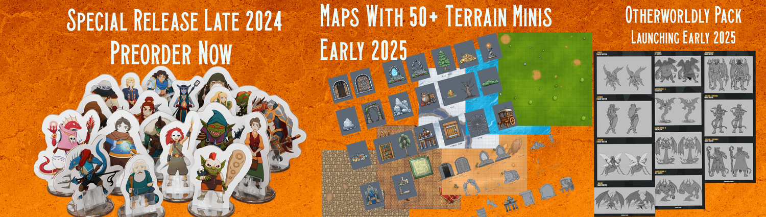 FULL TERRAIN PACK INCLUDED - 57 Terrain miniatures and 25 bases. You read that right.. That's our entire Terrain Pack included. 28-32mm scale. Perfectly sized for 5e etc.